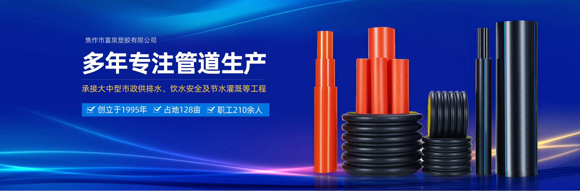 焦作市富泉塑膠有限公司,創(chuàng)立于1995年,是一家集研發(fā)、設(shè)計、生產(chǎn)、銷售為一體的大型管材企業(yè)。公司位于太極故里、黃河之濱一一河南焦作溫縣。公司占地128畝,現(xiàn)有職工210余人,其中具有中技術(shù)職稱的19人。生產(chǎn)、檢驗設(shè)備58臺(套),包括PVC實壁管生產(chǎn)線11套、PE實壁管生產(chǎn)線12套、HDPE雙壁波紋管生產(chǎn)線6套、PVC雙壁波紋管生產(chǎn)線5套,檢驗設(shè)備14臺(套)。主要產(chǎn)品有:Φ20mm-630mm、各種壓力規(guī)格的PVCU、PVC-M、PE給水管材,PVC-U節(jié)水灌溉管材,HDPE燃?xì)夂偷V用管材,DN200-800mm的HDPE、PVC雙壁波紋管及各種噴灌、滴灌工程材料。承接大中型市政供排水、飲水安全及節(jié)水灌溉等工程。  富泉塑膠公司重視產(chǎn)品的質(zhì)量、安全、環(huán)保和節(jié)能,在同行業(yè)中率先完成了“新華節(jié)水產(chǎn)品認(rèn)證”,全方面通過ISO9001:2008國際質(zhì)量管理體系、IS014001:2004環(huán)境管理體系和OHSAS18001職業(yè)健康安全管理體系的一體化導(dǎo)入,并建立起規(guī)范的現(xiàn)代企業(yè)管理體系。公司以“質(zhì)量”為先導(dǎo),采用質(zhì)量跟蹤、多環(huán)節(jié)把關(guān)的方法,組建具有行業(yè)水準(zhǔn)的企業(yè)技術(shù)檢測中心,常年委托水利部節(jié)水灌溉設(shè)備檢測中心、河南省產(chǎn)品質(zhì)量監(jiān)督檢驗院對產(chǎn)品跟蹤檢測,并由中國人民保險公司承保產(chǎn)品質(zhì)量。公司連續(xù)多年被河南省水利廳確定為“安全飲水設(shè)備、節(jié)水灌溉設(shè)備”定點生產(chǎn)企業(yè),并獲得“中國名優(yōu)產(chǎn)品”“質(zhì)量、服務(wù)、信譽(yù)AAA企業(yè)”“河南省**產(chǎn)品”“河南省水利企業(yè)”“河南省守合同、重信用企業(yè)”等榮譽(yù)稱號。  富泉塑膠公司堅持“用戶為上”的服務(wù)理念,長期以來,全方面關(guān)注客戶價值,不斷提升服務(wù)水平。服務(wù)隊伍常年為客戶的產(chǎn)品設(shè)計、施工、安裝提供合理的方案和全程細(xì)致、周到、**、快捷的技術(shù)服務(wù)。公司自成立以來,一直堅持以人為本的宗旨,塑造企業(yè)形象,并致力于新產(chǎn)品的開發(fā),憑借雄厚的技術(shù)開發(fā)能力,先進(jìn)的工藝制造流程,嚴(yán)格的質(zhì)量管理保證體系,優(yōu)良的售后服務(wù)網(wǎng)絡(luò),已成為河南省大的飲水、灌溉及排水管材設(shè)備制造商。產(chǎn)品暢銷全國,而且還以公司雄厚的綜合實力在業(yè)界中占據(jù)著重要的地位。